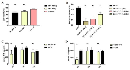 TF1 inhibited the adhesion ability of SC19 and SC19-mediated cytokine production. (A) TF1 had no cytotoxic effect on the epithelial cell Nptr through LDH release measurements. (B) Adhesion ability analysis of SC19 affected by TF1. (C) TNF-αproduction in serum of SC19-infected mice affected by TF1. (D) IL-6 production in serum of SC19-infected mice affected by TF1. The height of the bars indicates the mean values for the relative expression data ± SEM (ns, p > 0.05; * p < 0.05; ** p < 0.01; *** p < 0.001).