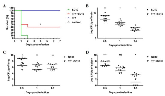 TF1 reduced the pathogenicity of SC19. (A) TF1-protected mice against SC19 infection, a significant difference in survival between different groups was analyzed by log rank test. (B) Bacterial burdens in the brains of the SC19-infected mice. (C) Bacterial burdens in the lungs of the SC19-infected mice. (D) Bacterial burdens in the spleens of the SC19-infected mice. The height of the bars indicates the mean values for the relative expression data ± SEM (ns, p > 0.05; * p < 0.05; ** p < 0.01; *** p < 0.001).