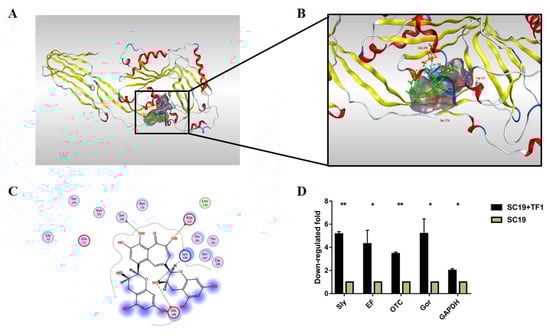 Molecular docking and qRT-PCR results. (A) 3D structure of Sly docked with TF1. (B) Enlarged view of the pocket after molecular docking of TF1 and Sly protein, where the amino acids Glu198, Lys190, Asp111, and Ser374 react with TF1. (C) Interactions between the binding site of TF1 and the amino acid of Sly protein. The hydroxyl groups of TF1 are linked to the amino acids of the Sly protein, the five hydrogen bonds are indicated with the green dotted arrows. (D) Virulence-related genes expression analysis of TF1 treated SC19 compared to untreated SC19. The height of the bars indicated the mean values for the relative expression data ± SEM * p < 0.05; ** p < 0.01).