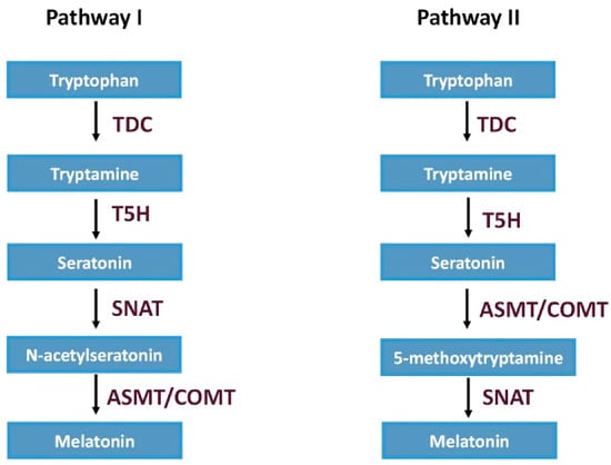 There are two known pathways in plant melatonin synthesis (Figure 2). Pathway I (Tryptophan→Tryptamine→Seratonin→N-acetylseratonin→Melatonin) is most common under usual conditions, while Pathway II (Tryptophan→Tryptamine→Seratonin→5-methylhydroxytryptamine→Melatonin) is believed to become prominent during stress conditions [33,35]. There are six enzymes involved in melatonin biosynthesis in plants: Tryptophan decarboxylase (TDC), Tryptophan Dihydroxylase (TPH), Tryptamine 5-hydroxylase (T5H), Serotonin N-acetyltransferase (SNAT), acetylserotonin O-methyltransferase (ASMT), and Caffeic acid 3-O-methyltransferase (COMT) [36].