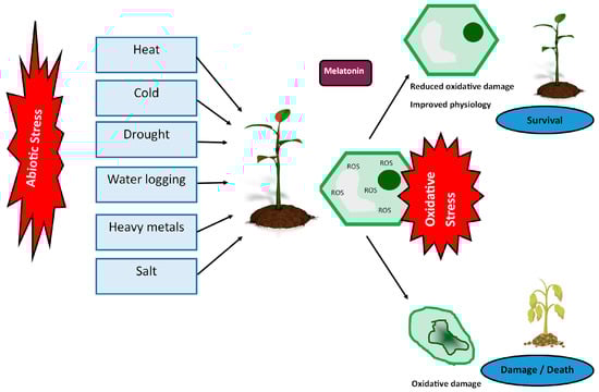 Abiotic stress enhances the accumulation of ROS, which creates oxidative stress. Oxidative stress damages plant cells by membrane lipid peroxidation and cell death, resulting in retarded growth, reduced yield, and/or plant death. Melatonin alleviates oxidative stress in plants and improves physiology resulting in enhanced abiotic stress tolerance.