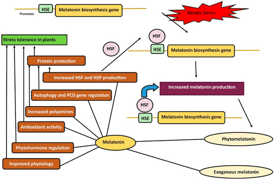HSF binds to the heat shock elements (HSE) in the promoter region of the melatonin biosynthesis genes to enhance the transcription. Exogenous melatonin uptake increases the total melatonin content, which stimulates melatonin biosynthesis gene expression leading to increased abiotic stress tolerance in plants.