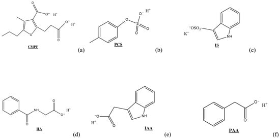 Chemical structure and charge location for (a) 3−carboxyl−4−methyl−5−propyl−2−furan propanoic acid (CMPF), (b) p−cresyl sulfate (PCS), (c) indoxyl sulfate (IS), (d) hippuric acid (HA), (e) indole−3−acetic acid (IAA), and (f) phenylacetic acid (PAA).