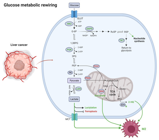 Metabolic rewiring of glucose in liver cancer cells and effects on immune cells infiltration. As illustrated in the review text, deregulation of glucose affects the recruitment and/or the activation of immune cells, potentially favoring immune escape of liver cancer cells. Abbreviations: 1,3BPG, 1,3-Bisphosphoglycerate; 2-HG, 2-hydroxyglutarate; 3PG, 3-Phosphoglycerate; G6P, glucose 6-phosphate; G6PD, glucose-6-phosphate dehydrogenase; GLUT, glucose transporter type; HK2, hexokinase 2; IDH, isocitrate dehydrogenase; LDH, lactate dehydrogenase; M2, M2 macrophage; MCT, monocarboxylate transporter; OAA, oxaloacetate; PCK1, phosphoenolpyruvate carboxykinase 1; PDH, pyruvate dehydrogenase; PEP, phosphoenolpyruvate; PK, pyruvate kinase; R5P, ribose 5-phosphate; Ru5P, ribulose 5-phosphate; SDH, succinate dehydrogenase; TKT, transketolase; αKG, α-ketoglutarate. Legend: green arrows and green bold text indicate up-regulated pathways; red arrows and red bold text indicate down-regulated pathways; * indicate mutations. Created with BioRender.com.