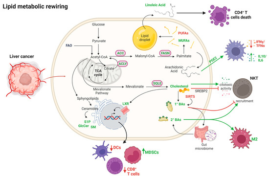 Metabolic rewiring of lipids in liver cancer cells and effects on immune cells infiltration. As illustrated in the review text, deregulation of lipids affects the recruitment and/or the activation of immune cells, potentially favoring immune escape of liver cancer cells. Abbreviations: ACC, acetyl-CoA carboxylase; ACLY, ATP citrate lyase; BAs: bile acids; DCs, dendritic cells; FAO, fatty acids oxidation; FASN, fatty acid synthase; GlcCer, glucosylceramides; M2, M2 macrophage; MDSCs, myeloid-derived suppressor cells; MUFAs, monounsaturated fatty acids; NKT, natural killer T cells; PGE2, prostaglandin E2; PUFAs, polyunsaturated fatty acids; S1P, sphingosine 1-phosphate; SM, sphingomyelin; SQLE, squalene epoxidase; SREBP2, sterol regulatory element-binding protein 2. Legend: green arrows and green bold text indicate up-regulated pathways; red arrows and red bold text indicate down-regulated pathways. Created with BioRender.com.