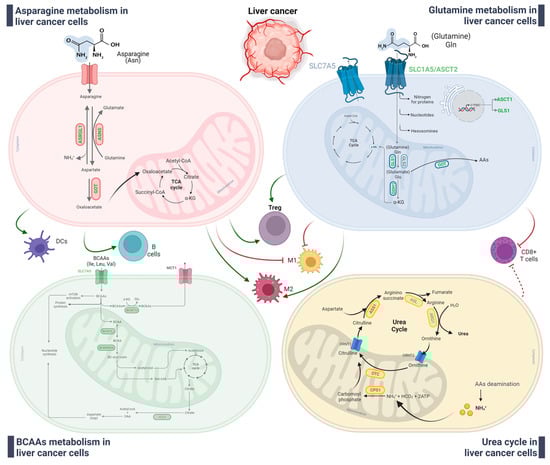 Metabolic rewiring of AAs in liver cancer cells and effects on immune cells infiltration. As illustrated in the review’s text, deregulation of AAs can affect the recruitment and/or the functionality of immune cells, potentially favor immune escape of liver cancer cells. Abbreviation: ASRGL1, L-asparaginase; ASNS, asparagine synthetase; GOT, aspartate aminotransferase; SLC7A5, solute carrier family 7 member 5; SLC1A5, solute carrier family 1 member 5 or ASCT2, alanine-, serine- and cysteine-preferring Transporter 2; GLS1/2, glutaminase 1/2; GDH1, glutamate dehydrogenase 1; α-KG, α-ketoglutarate; ARG1, arginase 1; ASL, argininosuccinate lyase; ASS1, argininosuccinate synthetase 1; OTC, ornithine transcarbamylase; CPS1, carbamoyl phosphate synthetase 1; ORNT1/2, ornithine transporter 1/2; BCAT1, branched-chain cytosolic aminotransferase; BCAT2, branched-chain mitochondrial aminotransferase; BCAAs, branched-chain amino acids; BCKAs, branched-chain α-keto acids; BCKDKHA, branched chain keto acid dehydrogenase; MCT1, monocarboxylate transporter 1; ACLY, ATP citrate lyase; DCs, dendritic cells; Treg, regulatory T lymphocytes. Legend: green arrows and green bold text indicate up-regulated pathways; red arrows and red bold text indicate down-regulated pathways. Created with BioRender.com.