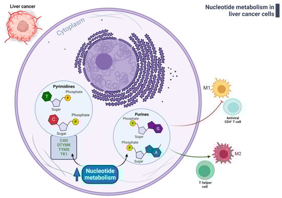 In relation to the nucleotide alteration observed in HCC, literature data indicate that purine metabolism and biosynthesis can affect the immune microenvironment of HCC (Figure 4). In particular, by analyzing a cohort of 372 HCC on TCGA database and by using the CIBERSORT algorithm Yang et al. revealed that HCC patients with both high purine biosynthesis and metabolism (PBhiPMhi) are characterized by low levels of M1 macrophages and CD4+ T cells as well as high infiltration of helper T cells and M2 macrophages [204].