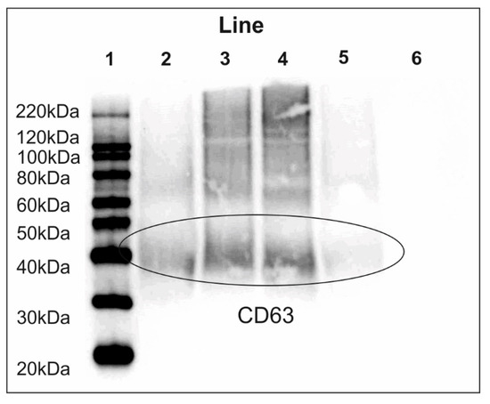 Tetraspanin CD63 is one of the proteins characteristic of exosomes [18]. The presence of CD63 was confirmed in the lysates of exosomes samples (Figure 1). Additionally, the exact number of exosomes was determined with an acetecylcholinesterase activity-based assay (FluoroCet, System Bioscience, Palo Alto, CA, USA).