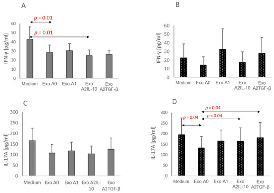 IFN-γ (A,B) and IL-17A (C,D) production in CD4+ T-cell cultures from multiple sclerosis-affected patients (A,C) and healthy donors (B,D) (with excluded autoimmune disease). After separation from PBMC, CD4+ T-cells from every donor were isolated by magnetic sorting, and cultured on 48-well culture plates (106 cells/well) with exosomes isolated from non-stimulated (Exo A0), pro-inflammatory cytokines stimulated (Exo A1) and anti-inflammatory cytokines (IL-10, TGF-β) stimulated (respectively Exo A2IL-10, Exo A2TGF-β) human astrocytes. Data shown as mean ± SEM. Comparisons between variables were made with a Wilcoxon signed-rank test.