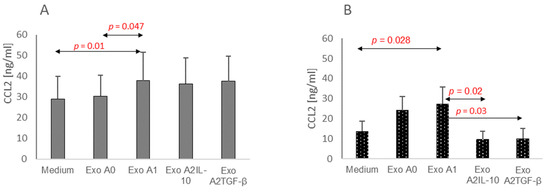 CCL2 production by CD4+ T-cells was upregulated in cell cultures pulsed with exosomes derived from astrocytes primed with proinflammatory cytokines, and compared with spontaneous CCL2 release. Such an effect was observed for cells from MS-affected persons and healthy donors (Figure 3). Furthermore, the CCL2 concentration in the culture media from CD4+ T-cells obtained from healthy donors was significantly lower in the presence of exosomes produced by IL-10- or TGF-β-primed astrocytes by comparison with its production by T-cells primed by exosomes from proinflammatory astrocytes (Figure 2B).