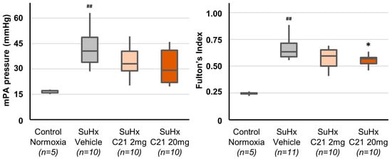 Mean pulmonary artery (mPA) pressure and right ventricular hypertrophy (Fulton’s Index) on day 56. The box and whiskers represent the median, interquartile range, minimum and maximum values. ## p < 0.01 compared with normoxic animals (Mann–Whitney U-test). * p < 0.05 compared with SuHx Vehicle animals (Kruskal–Wallis test).
