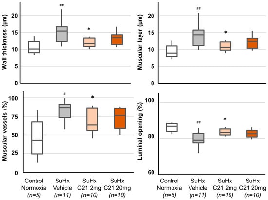 Wall morphology in vessels >100 μm. The box and whiskers represent the median, interquartile range, minimum and maximum values. # p < 0.05 and ## p < 0.01 compared with normoxic animals (Mann–Whitney U-test). * p < 0.05 compared with SuHx Vehicle animals (Kruskal–Wallis test).