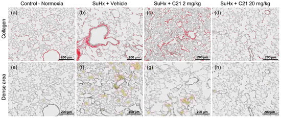 Representative images for fibrosis and collagen deposition and dense area in the lung of rats exposed to SuHx and C21. Areas with collagen deposition identified by picrosirius red staining (a–d). Dense areas containing fibroblasts, myofibroblasts, and newly formed collagen were identified by automated morphometric analysis (e–h).