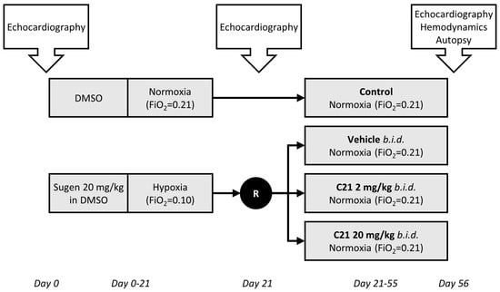 Overview of the study design. Animals received a single subcutaneous injection of Sugen (20 mg/kg) in 2 mL 100% DMSO and were kept under hypoxic conditions for 21 days (SuHx groups). On day 21, an echocardiogram was performed carried out to achieve an even distribution of the disease in the three study groups. The animals were exposed to ambient oxygen levels from day 22 to day 56. From day 21 to day 55, C21 (2 mg/kg or 20 mg/kg) or vehicle was administered twice a day by gavage. Control group animals received a single subcutaneous injection of 2 mL 100% DMSO on day 0 and were exposed to ambient oxygen for the total study period.