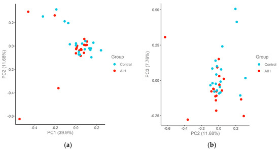 Principal component analysis (PCA) plots of the AIH and control cohort samples in the Cardiometabolic panel. The samples are colored according to the group. The percentage of variation that accounted for each principal component is shown in brackets along the x and y axis label. (a) PC1–PC2; (b) PC2–PC3.