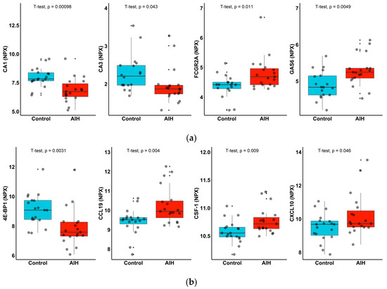 Levels of serum proinflammatory markers in patients with AIH (red) and controls (blue). Boxplots of up-regulated (GAS 6, FCGR2A, CXCL10 and CCL19) and down-regulated proteins (CA1, CA3 and 4E-BP1) in the (a) Cardiometabolic and (b) Inflammation panels. Un-paired t-test with corresponding p values are shown on plots for each protein.
