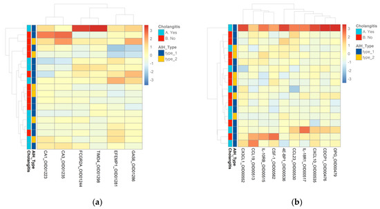 (a) Heatmap of AIH type 1 and AIH type 2 samples and AIH–ASC samples in the Cardiometabolic panel. (b) Heatmap of AIH type 1 and AIH type 2 samples and AIH–ASC samples in the Inflammation panel. Columns represent individual proteins, while rows represent the samples. Row and column dendrograms show the distance/similarity between the variables. The relative value for each protein is shown by the color intensity of the Z score with red indicating up-regulated and blue indicating down-regulated proteins.