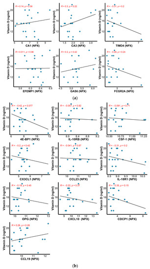Scatter plots showing the correlation (Pearson) between the top differentially abundant proteins in AIH and the levels of serum vitamin D. The fitted linear regression line of each scatter plot is depicted along with the R and p values. (a) Cardiometabolic and (b) Inflammation.