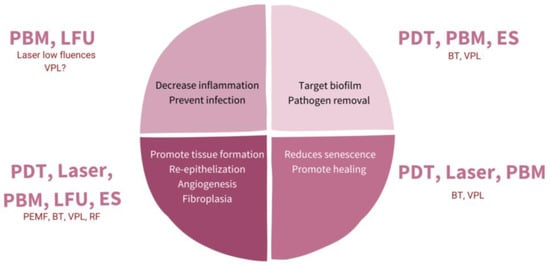 Diagram representing different targets with physical therapies (PT) for promoting wound healing (WH). PBM: photobiomodulation; LFU: low frequent ultrasound; PDT: photodynamic therapy; ES: electrostimulation; VPL: visible pulsed light; PEMF: pulsed electromagnetic fields; BT: biophotonic therapy; RF: radiofrequency.