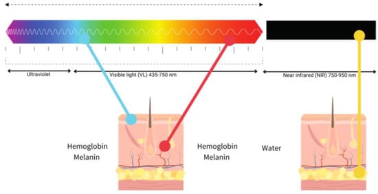LLLT has been intensely studied in WH, the near-infrared light (NIR) between 800 and 900 nm and red light (600–700 nm) being the most used. The use of light in a non-thermal effect is supported by the photon’s absorption of the cells’ receptors. The main three chromophores in the skin are melanin in the epidermis, hemoglobin in the dermis and water in all the skin [] and longer wavelengths achieve deeper penetration (Figure 4).