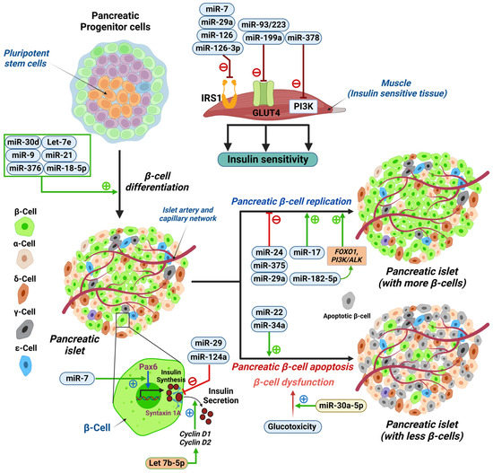 Schematic illustration showing micro RNAs (miRNAs) involved in pancreatic β-cell differentiation, function, and survival. miRNAs that regulate insulin action in insulin sensitive tissues (muscle, for example) are miR-7, miR-29a, miR-126, and miR-126-3p that negatively regulate IRS1; miR-93/223 and miR-199a that negatively regulate glucose transporter type 4 (GLUT4); and miR-378 that negatively regulates phosphoinositide 3-kinase (PI3K). miR-30d, let-7e, miR-9, miR-21, miR-376, and miR-182-5p positively regulate pancreatic β-cell differentiation from pancreatic progenitor cells. While miR-24, miR-375, and miR29a negatively regulate pancreatic β-cell replication, miR-17, and miR-182-5p (by activating the FOXO1, PI3K/ALK pathway) is a positive regulator. miR-22 and miR-34a induce pancreatic β-cell apoptosis. miR-30a-5p modulates the glucotoxicity induced β-cell dysfunction. miR-7 positively regulates Paired box protein (Pax-6) to enhance insulin synthesis in β-cells. Let-7b-5p positively regulates insulin secretion by modulating cyclin D1 and cyclin D2. miR-29 and miR-124a negatively regulate syntaxin 1A, which reduces insulin secretion from pancreatic β-cells. Pancreatic islets contain insulin producing (β-cells), glucagon producing (α-cells), somatostatin producing (δ-cells), pancreatic polypeptide producing (Ɣ-cells), and ghrelin producing (Ɛ-cells) endocrine cells. FOXO1, Forkhead box protein O1; PI3K, phosphoinositide 3-kinase; ALK, anaplastic lymphoma kinase. Illustration created using Biorender.com (with publication license).