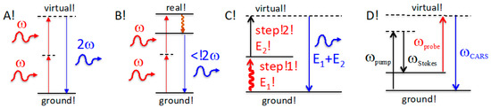 In anti-Stokes Raman, the first excitation may be caused by a previous photon followed by relaxation to a vibrationally excited ground state. The second excitation results in anti-Stokes scattering via a virtual state (Figure 1C). Anti-Stokes scattering is much weaker than Stokes Raman because it is a two-step, nonlinear process [14]. Accordingly, coherent anti-Stokes Raman (CARS) intensity depends on the power of excitation photons, including pump, Stokes, and probe (Figure 1D), because it uses two photons to populate an excited ground state, followed by a third probe-photon excitation. Thus, CARS involves three excitation steps, and thus a third-order process [15,16].