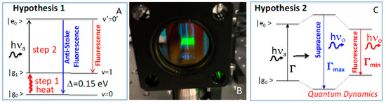 In fact, when both fluorescence and supracence are converging to the 0→0 position from opposite directions, the emission responds with maximizing intensity (Figure 6D). Corollary to these observations is that both supracence and fluorescence are exciting into the same 0→0 transition as proved earlier using the full quantum model [19,20], in which electrons and atoms are treated as two sub-quantum systems or dual quantum systems. Nevertheless, how does low-energy light excite into the higher 0→0 electro-optical transition to create high-energy supracence?