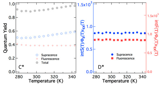 (A) The emission spectrum is divided by excitation line into supracence area (intS) and fluorescence area (intF). Such integrated supracence intensity (blue circles) and integrated fluorescence intensity (red squares) are plotted in (B). Both are plummeting such as the peak maximum S(T) in Figure 4. (C) Quantum yields using the total area under the emission curve ΦT are divided into supracence quantum yield ΦS and fluorescence quantum yield ΦF. (D) After calibrating to variations in quantum yields and extinction coefficients, the normalized integrated intensities for both supracence and fluorescence remain constant as temperature varies. Thus, temperature plays no role in both supracence and fluorescence excitation (n = 0 in Equation (3)).
