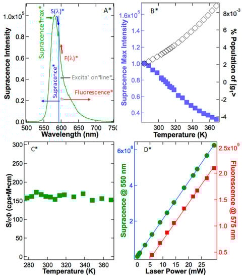 Specifically, hypothesis 2 does not consider heat as an excitation step; it only considers a single photon excitation as described by Equation (3). Figure 3D, Figure 4D and Figure 5C proved zero-order dependence on temperature, justifying no involvement of temperature during excitation. Figure 5D reveals that there is a linear relationship between the supracence intensity at 550 nm versus the excitation power at 561 nm (m = 1). This linear relationship is crucially important because it proves that only a single photon is involved in the excitation. In fact, the behavior of the supracence resembles very much like the manner of fluorescence in Figure 5D, which is also a single-photon-excitation phenomenon. These data prove that supracence is zero-order to temperature (n = 0) and first-order to photoexcitation (m = 1), fitting the supracence mechanism described by Equation (3), and disputing the anti-Stokes mechanism.