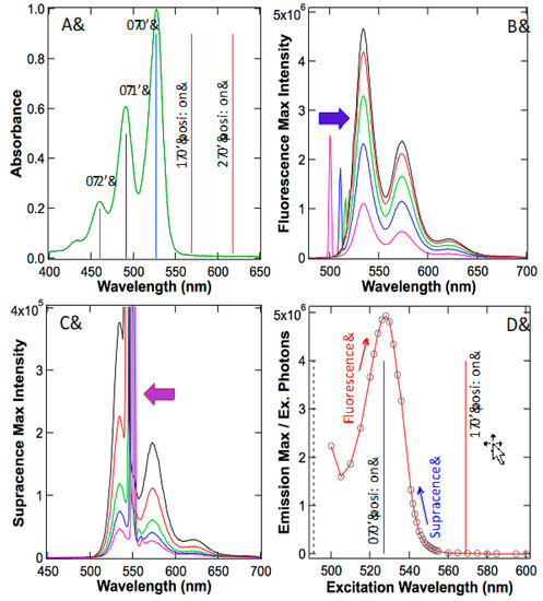 Only when excitation photons (Γ) have energies in-between maximum (Γmax) and minimum (Γmin) transition energies, i.e., Γmin < Γ < Γmax (Figure 2C and Figure 9E,F), supracence can occur, because there is no absorption when Γ < Γmin, and there is no supracence when Γ > Γmax as the energy gap cannot expand anymore. Anti-Stokes fluorescence would have excited far lower than Γmin using the phantom hot band, while fluorescence will continue to excite the molecule above excitation energy above Γmax. Both fluorescence and anti-Stokes fluorescence have no excitation specificity, thus producing broad excitation and emission bands. Supracence, however, has a narrow excitation band and a narrow emission band between Γmax and Γmin.