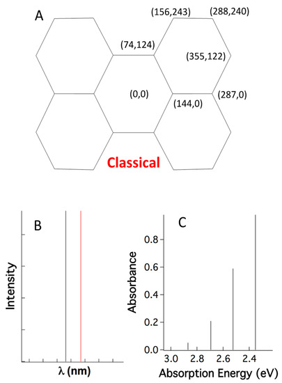 The enigma is that, as yet, no known linear optical processes create output photons with more energy than that of input photons. The reason that current understanding cannot rationalize supracence is that it drops the dual quantum realism and treats atoms in molecules as non-quantum particles. The quantum treatment of vibrating atoms stands alone and does not interact and integrate with the electronic quantum results. This way, quantum chemistry typically fixes the coordinates of atoms (Figure 7A) and determines the quantum behavior of the electrons. Thus, the atoms with fixed positions are treated as classical Newtonian particles, while the electrons are treated as quantum particles. In other words, the vibrational wavefunction of atoms |υ⟩ is reduced to a pair of classical coordinates (x, y), thus ignoring quantum structural dynamics. This classical-quantum hybrid treatment yields bizarre stick spectra for electronic absorption (Figure 7B, black stick) and emission (Figure 7B, red stick). After calculating vibrational levels and electronic levels separately, and then simply adding them together, the “coupled” vibronic absorption spectrum follows the Franck–Condon progression [28], but still comprises sticks, unlike experimentally broad and smooth peaks (Figure 7C).