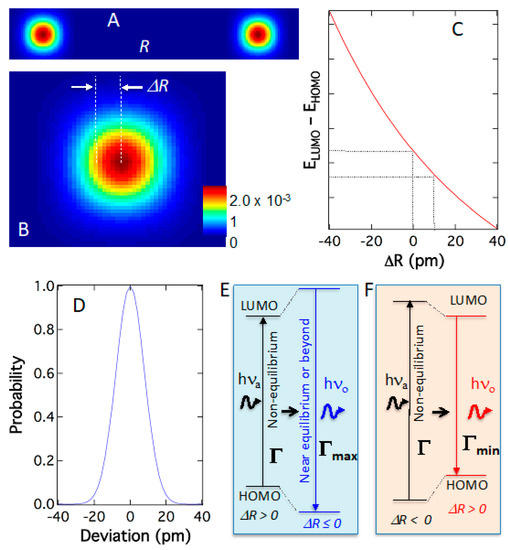 Figure 9A depicts the simplest model of two-atom in simplified full quantum treatment, where each atom distributes according to its wavefunction squared (probability), not classical coordinates. The reason for the simplest model is that current computation power is not adequate for calculating a single quantum system and consequently full quantum computations for dyes are beyond current computation capacity. Nonetheless, the full quantum model leads us in the correct directions. When the quantum atom elongates the bond or ΔR > 0 according to its quantum probability (Figure 9B), the electronic energy levels change; accordingly, particularly the absorption-or-emission gap or transition energy ELUMO–EHOMO diminishes (Figure 9C). Thus, as the quantum atoms dance in their orbitals following pre-determined quantum probability [υ]2, the transition energy disperses into a peak-shaped distribution around their most probable positions as shown in Figure 9D. These phenomena originate from quantum–quantum effects intrinsically and are independent of temperature or other perturbations. Such a correlated relationship reveals that the atomic position and electronic transition are strongly correlated. Therefore, bond elongation correlates to the shrinkage of electronic transition energy for absorption or emission and vice versa. This demonstrates that the quantum dynamics of the atoms will result in spectral dispersion in absorption and emission. Importantly, this means that there are multiple energies for absorption or emission, all within a narrow distribution of energy. Some absorb more energy and emit less, while others absorb less and emit more energy. For example, absorbing at elongated bonds and emitting at shortened bonds will result in supracence (Figure 9E), and conversely, fluorescence (Figure 9F).