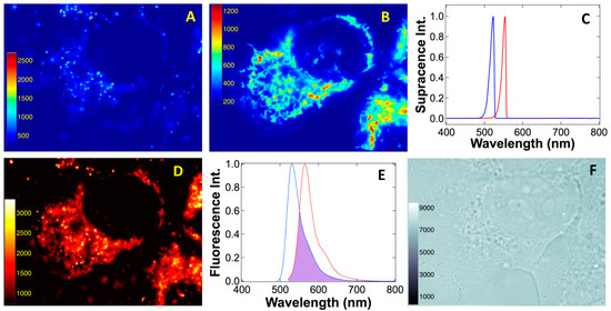 Supracence imaging of mitochondria has no measurable crosstalk from endosomes/lysosomes. Moreover, endosomes/lysosomes imaging has no mitochondrial encroachment. Fluorescence imaging at 532 nm, however, reveals both RhB sharp spots of endosomes/lysosomes and Rh123 worm-like patterns of mitochondria (Figure 10D). Not only is fluorescence excitation not selective, but, also, broad fluorescence emissions have a strong overlap in a large spectral region (Figure 10E). These results demonstrate the superiority of supracence at wavelength multiplexing and dyes with absorption or emission peaks separated by only 32 nm that can be effectively resolved during the imaging of a living cell (Figure 10F).