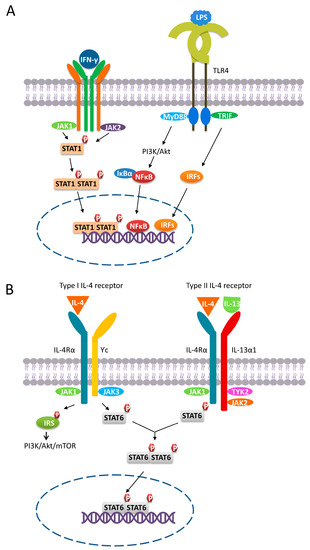 M1 and M2a polarization. (A) M1 macrophages polarize through signaling pathways mediated by STAT1, PI3K/Akt, NFκB, and IRFs. Binding of IFN-γ to its receptor leads to the recruitment of JAK1 and JAK2, inducing the phosphorylation of STAT1, which then dimerizes and translocates into the nucleus. In response to the LPS-TLR4 engagement, PI3K/Akt-, NFκB-, and IRFs-mediated signaling are triggered. (B) M2a macrophages polarize through the PI3K/Akt- and STAT6-mediated signaling pathways. Macrophages express both type I and type II IL-4 receptors. The engagement of the type I/II IL-4 receptor results in the phosphorylation and subsequent dimerization of STAT3. Once activated, STAT3 dimers translocate into the nucleus and trigger corresponding gene expression. In contrast, IRSs can only be activated by the type I IL-4 receptor and do not translocate to the nucleus. Instead, activated IRSs can induce signaling pathways such as PI3K/Akt-mediated signaling.