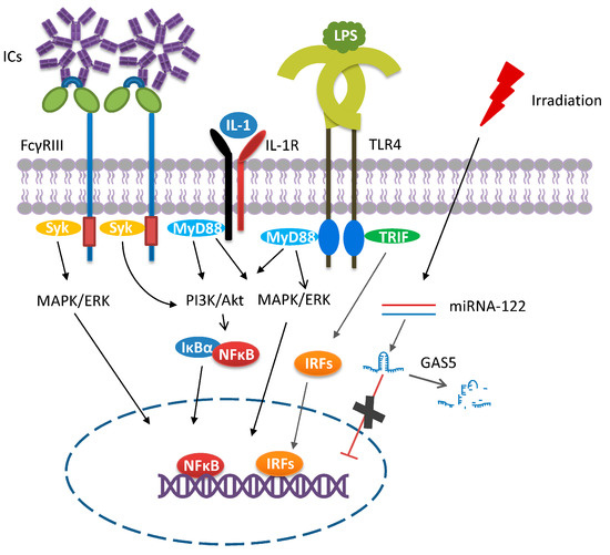 M2b polarization. The macrophage polarization toward the M2b phenotype needs two classical stimuli (ICs and LPS/IL-1). The crosslinking of FcγR by ICs triggers the activation of PI3K-, MAPK/ERK-, and NF-κB-mediated signaling pathways. To fully polarize, the binding of LPS or IL-1 to their respective receptors is also required, which then induces the activation of NFκB, PI3K/Akt, IRFs, and MAPKs. In addition, stimuli (e.g., irradiation, microRNA 122) other than the classical inducers have been described. The presence of long non-coding RNA GAS5 negatively correlates with M2b polarization. In response to irradiation exposure, the induced miRNA-122 expression leads to the degradation of GAS5, thereby favoring M2b polarization.