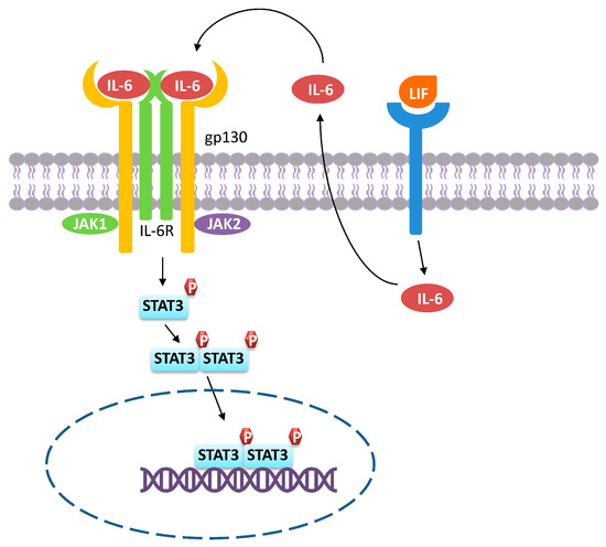 M2d polarization. The binding of IL-6 to the IL-6R/gp130 receptor complex leads to the recruitment of JAK1/2, which in turn phosphorylates STAT3, leading to STAT3 dimerization and translocation into the nucleus, where it activates gene transcription. LIF belongs to the IL-6 family and binding of LIF to its receptor results in IL-6 production. Thus, M2d macrophages can consume IL-6 in an autocrine manner.