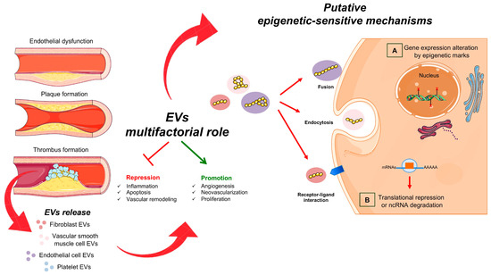 The vasculature controls homeostasis and the functional integration of tissues and organ systems [1,2]. Hemodynamic and bioactive stimuli stimulate the vasculature, which responds with multiple structural and phenotypic changes that are well described during the onset and progression both of cardiovascular diseases (CVDs) and cancer [1,2,3]. Starting from fatty streaks, cell components of the vascular wall change their function, contributing to the progression of atheromatous plaques, chronic inflammation and clinical manifestations of coronary heart disease (CHD) [4,5,6,7,8,9]. Endothelial adaptative remodeling also occurs during cancer growth, representing a key event during the transition from local to systemic and metastasis dissemination [10]. Different metabolic and epigenetic signaling between endothelial cells and the microenvironment are crucial to the initiation and progression of pathological vascular modifications [1,2,3,11]. Therefore, investigation of the pathophysiology of the vascular remodeling mechanism both in CVDs and cancer is of great value for finding new disease targets and biomarkers. A central role in vasculature modifications is the crosstalk between several cell types necessary to transfer information from one site to another. An emerging body of evidence implies that extracellular vesicles (EVs), which circulate in biological fluids, are vehicles of a variety of molecules to recipient endothelial cells during CVD and cancer growth [12,13,14,15,16,17,18]. However, the role of EVs and their epigenetic influences in the pathogenesis of vascular damage are poorly explored. Here, we discuss the epigenetic effects exerted by EVs on the vasculature both in coronary heart disease (CHD) and cancer.