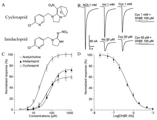 Acetylcholine (ACh), imidacloprid, and dihydro-β-erythroidine (DHβE) were purchased from Sigma-Aldrich (St. Louis, MO, USA). Cycloxaprid was synthesized and purified, as previously reported []. In the electrophysiological experiments, chemical solutions were freshly prepared in the modified Ringer’s solution (NaCl 150 mM, KCl 2.8 mM, HEPES 10 mM, MgCl2 2 mM, atropine sulfate 0.5 µM; pH 7.2, adjusted with NaOH).