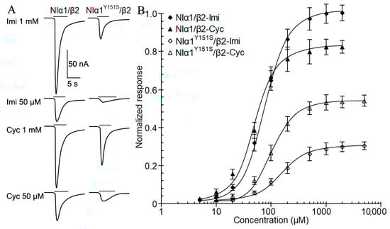 Effects of Y151S mutation on agonist potency on the receptor Nlα1Y151S/β2. (A) Representative currents elicited by imidacloprid and cycloxaprid on wildtype receptor Nlα1/β2 (left) and mutant receptor Nlα1Y151S/β2 (right). The concentrations (µM) were provided following drug name, imidacloprid (Imi) and cycloxaprid (Cyc). (B) Concentration-response curve for inward currents induced by imidacloprid and cycloxaprid (n = 6–12). The currents were normalized to the maximum currents elicited by 1000 µM imidacloprid on the wildtype receptor Nlα1/β2. Data were presented as mean ± SEM.