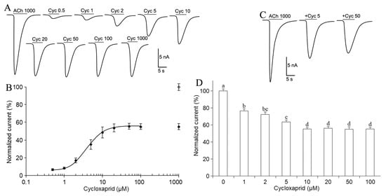 As mentioned above, cycloxaprid activated cockroach neuronal nAChRs in a concentration-dependent manner. Here, the concentration-response curve for inward currents induced by cycloxaprid was constructed. Fitted with the Hill equation, the calculated EC50 value for cycloxaprid on cockroach neurons was 3.82 ± 0.41 µM with the Hill coefficient of 1.07 ± 0.14 (Figure 3B, n = 12).