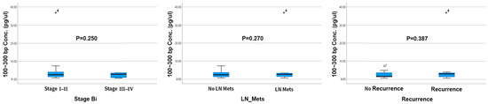 The mean cfDNA concentration in blood samples from patients with cholangiocarcinoma, as determined using a 4200 TapeStation (Table S1), was 3.99 ng/μL (range 0.29–37.24 ng/μL), whereas the cfDNA concentration in the patient with a liver abscess was 0.60 ng/μL. Evaluation of patients who underwent surgery showed that the mean postoperative cfDNA concentration (3.43 ng/μL; range 0.29–12.20 ng/μL) was lower than the mean preoperative cfDNA concentration (4.54 ng/μL; range 0.60–37.24 ng/μL), although the difference was not statistically significant (p = 0.342). Increased cfDNA levels were not significantly associated with poorer clinicopathologic factors, including increased pathologic stage (p = 0.250), lymph node metastasis (p = 0.270), or tumor recurrence (p = 0.387) (Figure 2).