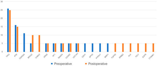 Changes of frequency of alterations of mutated genes in preoperative and postoperative ctDNA samples of patients with cholangiocarcinoma.