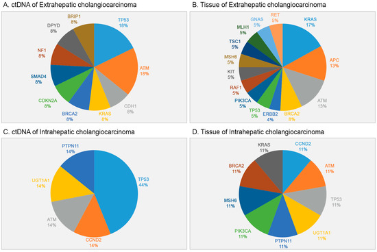 Frequency of alterations of mutated genes in (A,C) preoperative ctDNA samples and (B,D) corresponding tumor samples from patients with (A,B) extrahepatic cholangiocarcinoma and (C,D) intrahepatic cholangiocarcinoma.