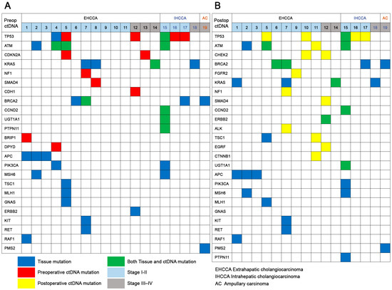 The present study also compared disease-associated mutations in pre- and postoperative ctDNAs and corresponding tumor tissues. Preoperative ctDNA may have potential significance as a substitute for invasive biopsy, allowing evaluation of the genetic profiles of tumors without the need for tissue sampling. Compared with the genetic profiles of tumor tissues, the genetic profiles of preoperative plasma cfDNA had a positive predictive value of 42%. New somatic mutations were detected in preoperative ctDNA from 47% of patients with cholangiocarcinoma, suggesting that ctDNA genetic profiling did not fully reflect the somatic mutations present in primary tumors, thereby limiting the clinical application of ctDNA profiles. A comparison of ctDNAs and FFPE samples showed that the rate of concordance of KRAS mutations was 42.9% [20]. Moreover, ctDNA was found to have high sensitivity (90–94.7%) and specificity (96.7–99.9%) for predicting tumor DNA SNVs of frequently mutated genes [19,21]. Genetic alterations were found to be dependent on tumor origin (intrahepatic, extrahepatic, or ampulla) [16], target samples (plasma or bile) [18], and assay methods (digital droplet PCR, classic targeted sequencing, or liquid platform) [20,22], with different patterns and frequencies of ctDNA somatic mutations and correlation rates.