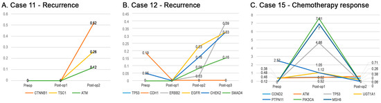 ctDNA detection in patients with mixed clinical responses: disease progression in (A,B) patients with recurrence and (C) a patient who responded to chemotherapy.