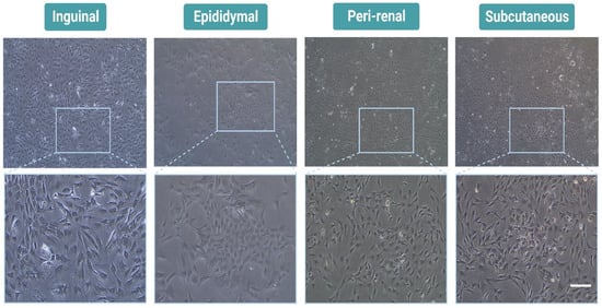 Four different sites were selected to harvest the epididymal, inguinal, peri-renal, and back subcutaneous adipose tissue under strict sterile conditions (Figure 7). The obtained adipose tissue was thoroughly cleansed with PBS before being put in a sterile culture plate and diced using sterile scissors. After that, chopped adipose tissue was put into a shaking bath of Hank’s balanced salt solution (HBSS, 14175-095, 500 mL, Life Technologies Corporation, New York, NY, USA) with 0.1% (w/v) collagenase type 1 (1 mg/mL; Gibco by Life Technologies, Waltham, MA, USA) for 1 h at 37 °C. We added cold HBSS to counteract the effects of the collagenase. We attained a high-density cell pellet after centrifugation (800× g for 10 min). To eliminate the solid aggregates, 100 µm filters (BD Falcon, Bedford, MA, USA) were used. The pellet was resuspended, and the RBCs were lysed using a 1 mL RBCs lysis buffer (Promega, Mannheim, Germany). The cell pellet was then resuspended in Dulbecco’s Modified Eagle Medium (DMEM, 043-30085, Fujifilm Wako Pure Chemical Corporation, Osaka, Japan), which served as the foundation for the culture. This medium contained 4500 mg/L D-glucose, 4 mM L-glutamine, 110 mg/L sodium pyruvate, 10% fetal bovine serum (FBS, F2442-500ML, Sigma Aldrich, St. Louis, MI, USA), 1% non-essential amino acids, and 1% penicillin-streptomycin (Penicillin, Streptomycin, Amphotericin B suspension (×100), 161-23181, Fujifilm Wako Pure Chemical Corporation, Osaka, Japan) []. Unless otherwise noted, all compounds were purchased from Sigma-Aldrich (St. Louis, MO, USA). Following isolation, cells were cultured on 75 cm2 Nunclon culture dishes (Thermo Fisher Scientific, Waltham, MA, USA) at a density of 5 × 105 cells/dish. In a humidified incubator, cells were grown under conditions of 37 °C, 95% humidity, and 5% CO2. The DMEM medium was switched out every three days until 80% confluency was reached. After separation using 0.25% trypsin (35556-44, 5 g/L trypsin/5.3 mmol/L-EDTA, Nacalai tesque, Inc. Kyoto, Japan) at 37 °C, the cells were reconstituted in DMEM with 10% FBS and grown in fresh culture dishes. When 80% confluence was achieved, cells were passaged, and we utilized third-passage cells in all experiments attributed to their high growth rate, which was advantageous for further assessments.