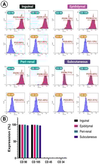 Expression of different cell surface markers in the cultured third-passage cells isolated from different adipose tissue harvesting sites in male SD rats. (A) Representative histograms for the expression of various surface markers: CD 90 and CD 105 with positive expression, and CD 45 and CD34 with negative expression. (B) Values of the expression % of each marker. Data were analyzed via one-way analysis of variance (ANOVA) followed by Tukey’s post hoc test and presented as mean ± SEM. No significance was detected.