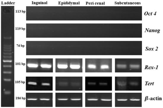 The ability of the r-AdMSCs harvested from various sites to express the pluripotency genes was tested using reverse-transcriptase PCR (RT-PCR). Octamer-binding transcription factor 4 (Oct4), embryonic stem-cell-specific homeobox protein (Nanog), SRYbox-containing gene 2 (Sox 2), reduced expression 1 (Rex-1), and telomerase reverse transcriptase (Tert) genes were utilized. To assess the efficacy of PCR, β-actin was employed as a control (Table 2). Total RNA from r-AdMSCs of the third passage from different harvesting sites was isolated using the FastGene RNA Premium Kit (Nippon Genetics, Tokyo, Japan). The quantity and quality of RNA were assessed using a NanoDrop 2000 ultra-micro spectrophotometer (Thermo Fisher Scientific, Cambridge, MA, USA). Then, the cDNA was synthesized via the reverse transcription of 1 µg of RNA (OD260/OD280 ≈ 2.0) by applying the ReverTra Ace™ qPCR RT Master Mix kit (Toyobo Co., Ltd., Osaka, Japan). For PCR amplification, the resultant cDNA was utilized. PCR cycling was accomplished in a Veriti Thermal Cycler (Thermo Fisher Scientific, Waltham, MA, USA) according to []. All examinations were carried out in triplicate. To visualize the PCR products, gel electrophoresis was performed (Figure 7).