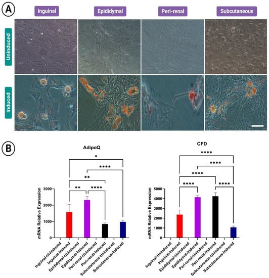 Adipogenic induction of the r-AdMSCs isolated from diverse harvesting sites. (A) Representative light microscopic images of the third-passage cultured induced and uninduced cells for qualitative assessment of the adipogenic differentiation. (B) Quantitative assessment of the adipogenic induction genes: Adiponectin (AdipoQ) and complement factor D (CFD). Scale bar: 200 µm. Data were analyzed via one-way analysis of variance (ANOVA) followed by Tukey’s post hoc test and were presented as mean ± SEM. * p < 0.05, ** p < 0.01, and **** p < 0.0001. The presented data are representative of four independent experiments.