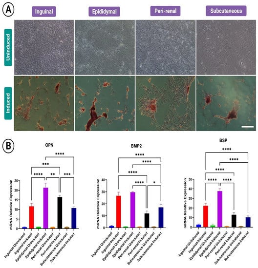 The quantification values of the expression of osteogenic genes of the cultured cells from variable sites are presented in Figure 5B. The induced cells from different sites had a variable degree in the expression of the osteogenic genes. Epididymal cells showed the highest degree of OPN, BMP2, and BSP expression. There was a significant elevation (p < 0.05) in the expression of OPN and BSP in the epididymal cells compared to the other cells. No significant difference was recorded in the expression of BMP2 between the epididymal and inguinal cells, where cells from these two sites had a marked increase in the expression of BMP2 compared to the peri-renal and the subcutaneous sites. The inguinal cells presented a significantly increased expression of OPN, BMP2, and BSP compared to those of the peri-renal and subcutaneous sites. These results indicate that both the epididymal and inguinal sites had the best osteo-induction potentials (Figure 5).